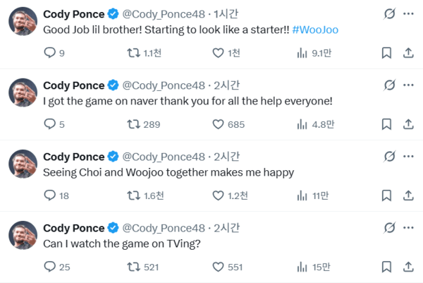정우주의 쾌투에 감탄한 것은 팬들뿐만이 아니다. 올해 함께 한화 유니폼을 입고 팀의 준우승에 힘을 보탠 폰세 역시 정우주의 투구를 실시간으로 지켜보며 기뻐하는 반응을 보였다.