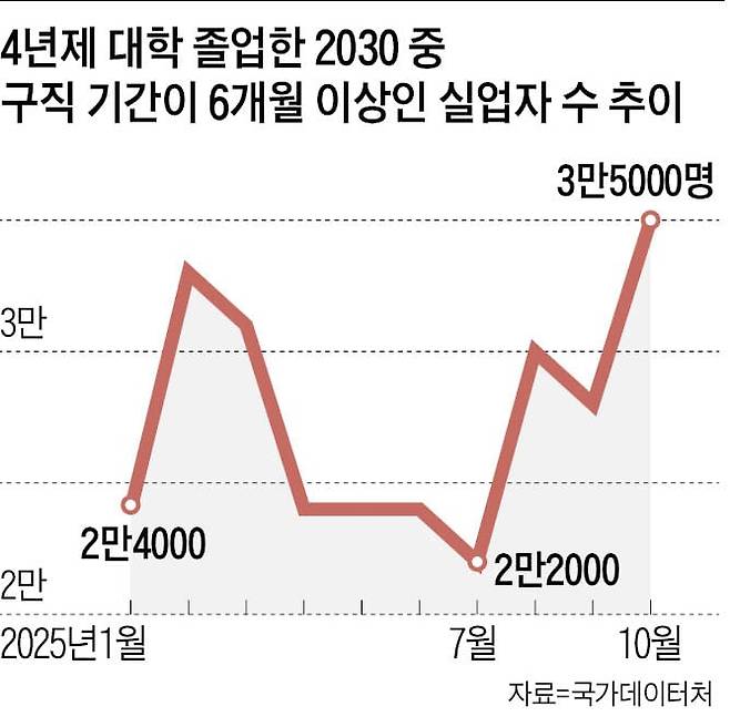 2030의 고용 한파로 전체 장기 실업자도 빠르게 늘고 있다. 6개월 넘게 일자리를 구하고 있는 장기 실업자 수는 지난달 11만9000명으로, 코로나 여파가 있던 2021년 10월(12만8000명) 이후 4년 만에 가장 많았다.
