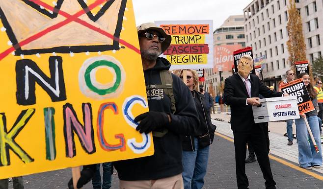 | 백악관 인근서 ‘노 킹스’ 시위대 행진 15일 미국 워싱턴 백악관 인근에서 도널드 트럼프 대통령의 독단적인 국정 운영을 비판하는 시민들이 ‘노 킹스’(왕은 없다)라는 팻말을 들고 행진하고 있다. 최근 야당 민주당과 진보 진영은 트럼프 대통령과 성범죄자 제프리 엡스타인의 연루 의혹에 관한 문건을 모두 공개하라고 대통령 측을 압박하고 있다. ‘여자 트럼프’로 불리는 마저리 테일러 그린 공화당 하원의원 또한 “문건을 공개하라”며 대통령과 대립하고 있다. 워싱턴=AP 뉴시스 |