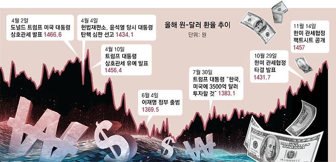 원-달러 환율의 주간 거래 기준 종가가 7일부터 6거래일 연속 1450원을 웃돌고 있다. 탄핵 정국, 도널드 트럼프 미국 행정부의 관세 발표가 이어진 3∼4월 이후 다시 고환율의 일상화가 재연됐다. 당시에는 달러화가 강세였지만 현재는 ‘약달러’ 상황이라 원화의 약세가 더 특징적이라는 평가가 나온다.