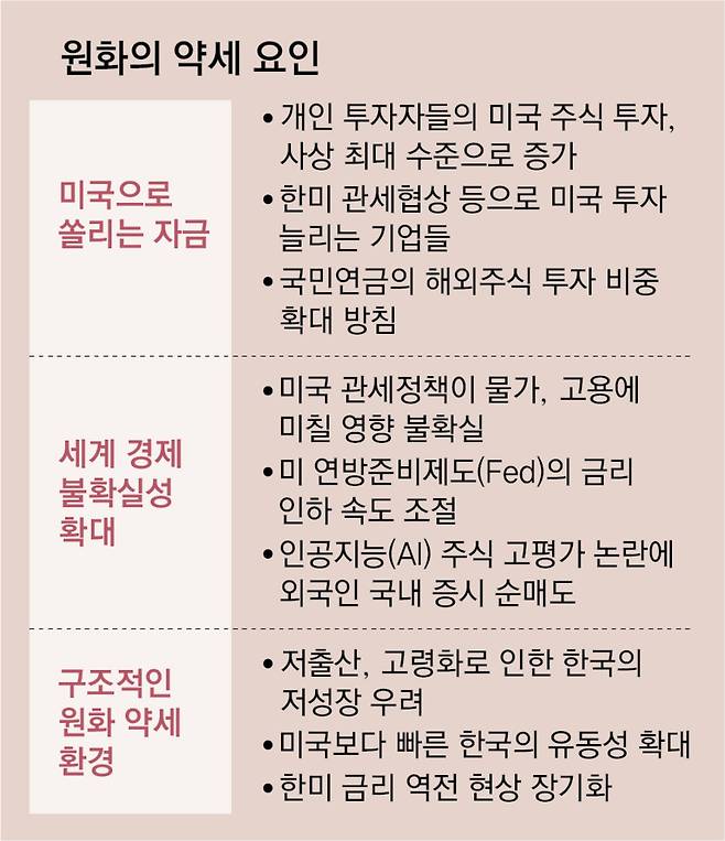 외국 자본이 국내 증시를 외면하고 한국 투자를 꺼리면 장기적으로 한국 경제 성장도 지장을 받을 수밖에 없다. 석병훈 이화여대 경제학부 교수는 “한국과 미국 경제의 기초체력 격차가 벌어졌다는 (투자자들의) 판단이 환율에 나타난 것”이라며 “기업들의 대미 투자가 계속 는다면 원-달러 환율이 1500원 수준까지 올라갈 수 있다”고 관측했다.
