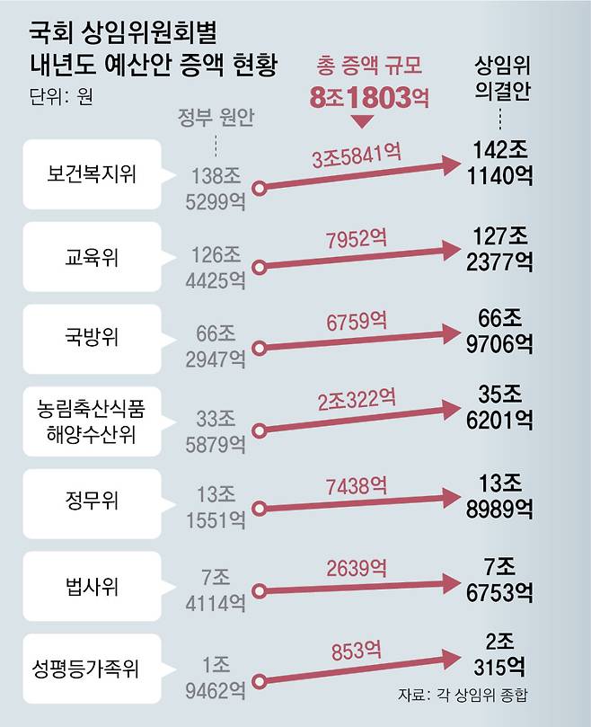 17일 각 상임위에 따르면 16일까지 심사를 마친 농림축산식품해양수산위원회와 보건복지위원회 등 상임위 7곳이 증액한 예산은 총 8조1803억 원으로 집계됐다.