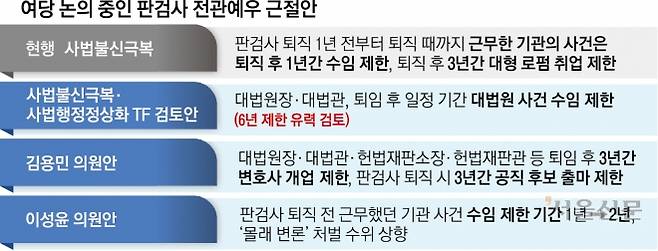 사법 개혁을 추진 중인 더불어민주당이 전관예우 근절을 위해 대법원장과 대법관은 퇴임 후 최대 6년 동안 대법원 사건을 수임하지 못하게 하는 방안을 검토 중인 것으로 16일 파악됐다. 퇴직 후 1년으로 직전 근무 법원의 사건 수임이 제한되는 일반 판사와는 차원이 다른 제한을 두겠다는 것이다. 국민의힘은 사법 독립을 뒤흔드는 ‘대법원 길들이기’라고 비판했다.