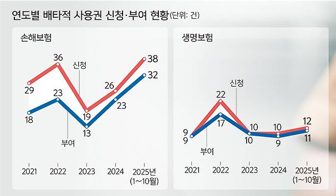 16일 보험업계에 따르면 올해 1∼10월 손해보험협회·생명보험협회 신상품심의위원회가 부여한 배타적 사용권은 총 43건으로 집계됐다. 손보협회와 생보협회에서 각 32건, 11건이 승인됐다. 이미 지난해 연간 건수인 32건(손보 23건·생보 9건)을 넘어섰다. 특히 손보업계의 경우 올해 신청(38건)·승인(32건) 건수 모두 역대 최다를 기록했다. 최근 3년 연속 증가 추세인 가운데 지난해와 비교해서도 신청과 승인 건수가 각 12건, 9건 늘었다.