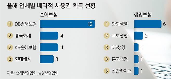 업체별로는 손보업계에서 DB손해보험(12건), 생보업계에선 한화생명(6건)이 올해 가장 많은 배타적 사용권을 획득했다. 지난달부터 부여 기간이 기존 최장 1년에서 1년6개월까지 확대된 만큼, 보험사들의 배타적 사용권 획득 경쟁에 더 불이 붙을 것으로 보인다.