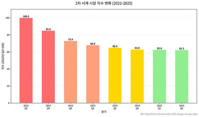 최근 럭셔리 2차 시장은 ‘극심한 양극화’ 상태라는 분석도 나온다. 투기 거품이 꺼지자, 시장은 두 부류로 갈라졌다. '진짜 희소성을 가진 자산'과 '인위적 희소성에 의존하던 자산'이다. 모건스탠리와 워치차트 등에 따르면 2차 시계 시장 지수는 올해 들어 하락 폭이 크게 줄었다. 올 1분기 0.4% 감소, 2분기 0.3% 감소를 기록했다. 약 2년 넘게 이어진 하락세 이후, 13분기 만에 가장 낮은 분기 하락률이다.