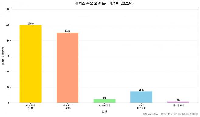 다만 희소성이 강한 이른바 ‘트로피 자산’은 여전히 강세를 보였다. 대표 사례는 롤렉스 데이토나다. 워치차트에 따르면 지난 12일 기준 신형 데이토나 스틸 화이트 다이얼(Ref. 126500)의 리테일 가격은 약 1만 6000달러 수준이었다. 2차 시장에서는 약 3만 1907달러에 거래된다. 프리미엄이 여전히 100% 수준이다. 구형(Ref. 116500)도 약 90% 프리미엄을 유지한다.