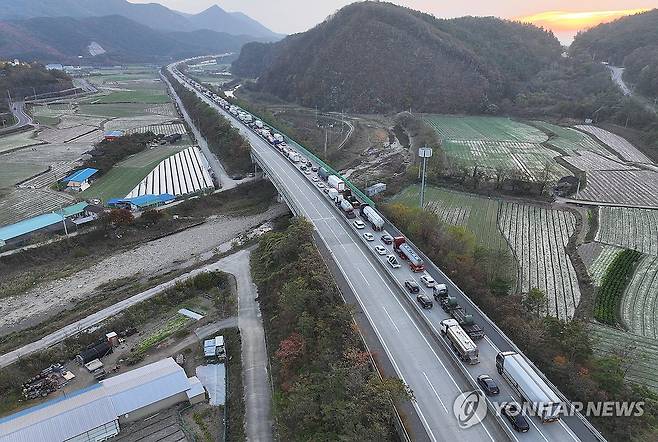 (영천=연합뉴스) 윤관식 기자 = 17일 오전 3시 12분께 상주영천고속도로 양방향에서 대형 교통사고로 화재가 발생한 가운데 사고 수습으로 인해 통제된 고속도로에 차량이 줄지어 정차해 있다. 2025.11.17