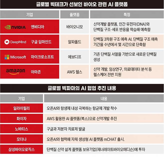 구글 딥마인드의 알파폴드, 마이크로소프트의 에보디프라는 각각 단백질 3차원 구조 예측, 기존 단백질 서열을 바탕으로 한 단백질 생성 등의 기능을 갖추고 있다. 아마존 AWS 헬스는 신약개발부터 임상, 의료데이터 분석 등 헬스케어 분야 전반을 지원한다. 구글의 알파폴드 개발자인 데미스 허사비스(딥마인드 공동대표)와 존 점퍼(딥마인드 수석연구원)는 AI 기술을 이용해 신약개발, 단백질 기능 연구에 기여한 공로로 지난해 노벨화학상을 받았다.