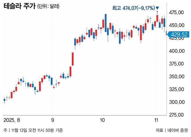 미래 사업 속도전에 테슬라 주가는 400달러대 지지선을 형성한 모습이다(그래프 참조). 안동후 이사는 "전기차 판매가 부진하다는 보도가 계속 나오는데도 주가가 옆으로 길어지기만 하는 이유는 시장이 AI, 로보틱스에 대한 프리미엄을 주고 있기 때문"이라고 말했다. 이어 그는 "최근 에너지저장장치(ESS) 매출이 급증한 것도 전기차 약세를 어느 정도 보충하는 측면이 있다"면서 "향후 미래 사업 전환이 가시적 성과를 보일 때마다 주가가 단기로 탄력을 받을 것"이라고 덧붙였다.