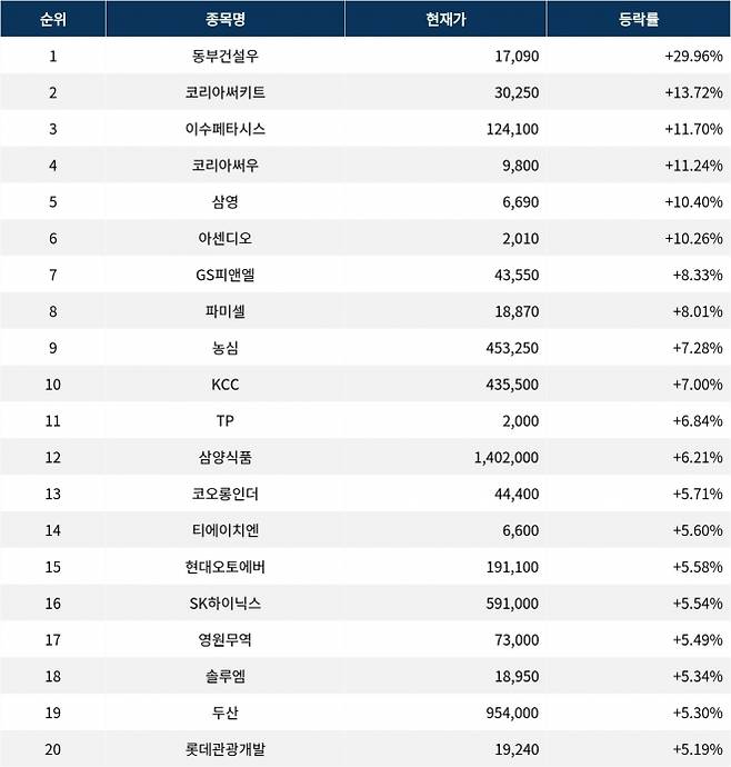 [서울데이터랩]‘동부건설우’ 29.96% 폭등…실시간 상승률 1위