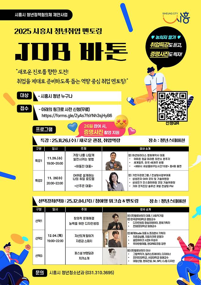 ‘잡바톤’은 시흥시 청년정책협의체 창업·일자리분과에서 제안한 사업으로, 취업 준비 과정에서 청년들이 겪는 어려움을 해결하기 위해 마련됐다.