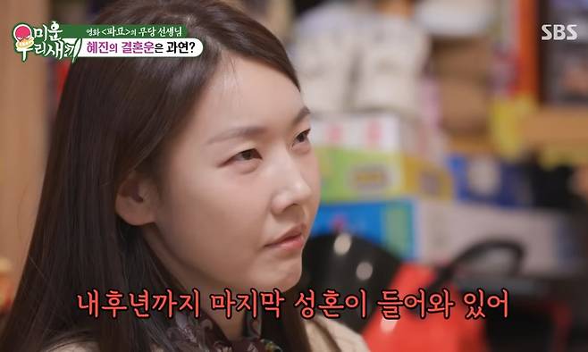[TV리포트=신윤지 기자] 모델 겸 방송인 한혜진(42)의 연애운과 결혼운이 공개됐다. 지난 16일 방송된 SBS 예능 '미운 우리 새끼'에서는 한혜진이 무속인 고춘자를 방문해 점을 보는 모습이 공개됐다.