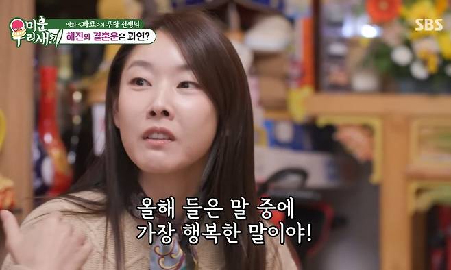 이어진 점괘에서는 결혼운도 언급됐다. 무속인은 "내후년까지 성혼운이 들어와 있다. 100% 결혼할 사람이 있다"며 "연하에 인연이 있다"고 덧붙였다. 이 말을 들은 한혜진은 "올해 들은 말 중 가장 행복한 말"이라며 웃음을 감추지 못했다.