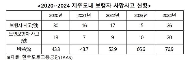 한국도로교통공단 교통사고분석시스템(TAAS) 분석 결과, 2024년 제주 보행사고 사망자 26명 중 20명(76.9%)이 65세 이상 고령자다. 2020년(43.3%)보다 33%p 증가한 것이다.