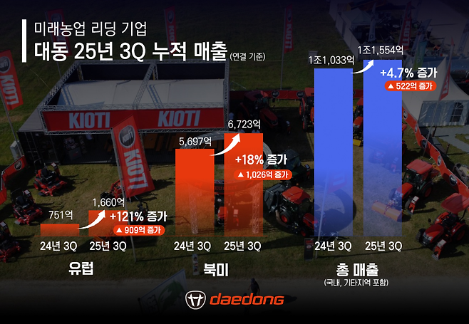 북미에서는 상반기부터 이어온 신규 딜러망 확충, 작업기 라인업 강화, 지역 특화 판촉 프로그램, 단계적 가격 인상 등이 고른 성과로 이어졌다. 대동은 내년부터 북미 지역에서 농기계뿐 아니라 사업 영역을 확장해 지속 성장 기반을 마련할 계획이다. 소형 굴착기를 도입해 소형건설장비 시장 경쟁력을 강화하고 서비스·부품·작업기 사업을 확대해 매출 구조 다변화와 안정적인 수익성 확보를 추진한다.