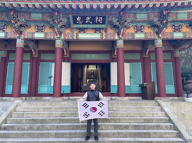 | ▲ 한산도 제승당 충무사 앞에서 임시의정원 태극기를 들다 |