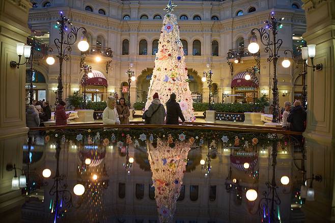 [모스크바=AP/뉴시스] 16일(현지 시간) 러시아 모스크바에서 시민들이 새해와 크리스마스 장식으로 꾸며진 굼(GUM) 백화점 내부를 구경하고 있다. 2025.11.17.