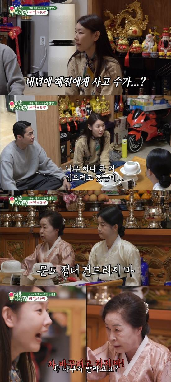 이어 무당은 "집을 새로 지었죠? 정원 쪽 손댈 자리가 있냐"고 물었고, 한혜진은 "나무 큰 거 심으려고 했다"고 답했다. 무당은 "안 된다. 나무 심다가 사고 난다. 살아있는 목씨는 집과 나하고 맞아야 한다. 삼재 동안에는 집 그대로 놔둬야 한다. 터주가 안정되고 있다. 아기자기하게 우물도 하고 싶고 하지 않나. 절대 안 된다. 돌도 가져다 놓지 마라. 들어가는 문도 새로 건드리지 말아라"라고 단호하게 말했다.