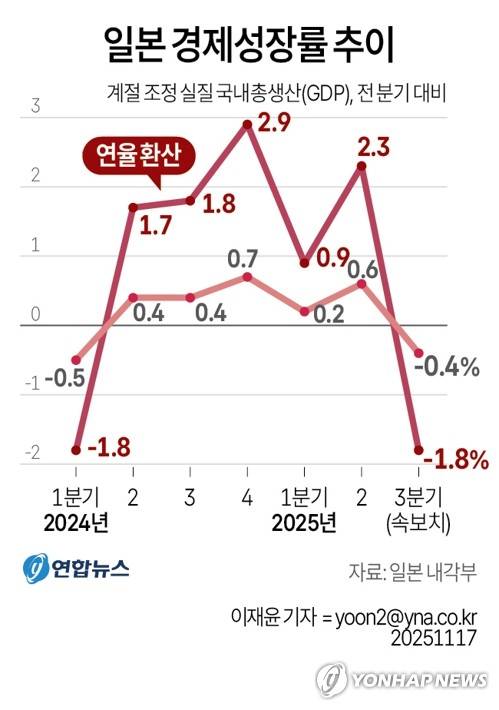 일본 내각부가 17일 발표한 올해 3분기 실질 국내총생산(GDP·속보치)은 전 분기보다 0.4% 감소했다. 연율 환산 기준 성장률은 -1.8%다.