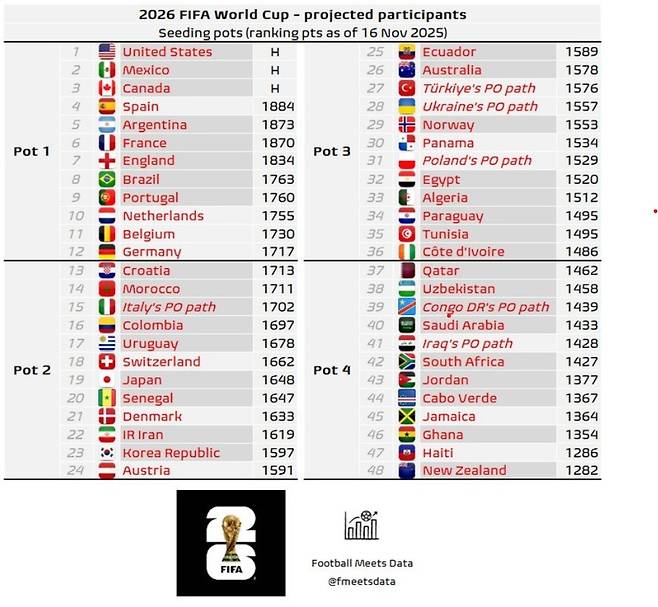 축구 관련 콘텐츠를 다루는 '풋볼 미츠 데이터'는 17일 열린 월드컵 예선이 끝난 뒤 경기 결과를 반영해 월드컵 본선 시드 현황을 새롭게 공개했다. 주목할 만한 부분은 월드컵 본선 진출에 성공한 노르웨이의 포트3 배정, 이탈리아와 콩고민주공화국의 플레이오프 등이었다.