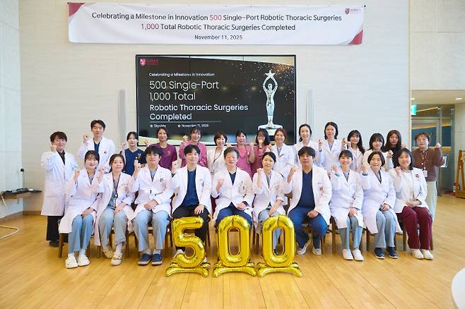 ‘단일공 흉부 로봇수술 500례’ 달성에 앞서 김 교수는 단일공 및 다공(3~4개 절개창으로 수술) 로봇수술을 포함한 ‘흉부 로봇수술 누적 건수 1천례’를 지난 10월에 달성하기도 했다.