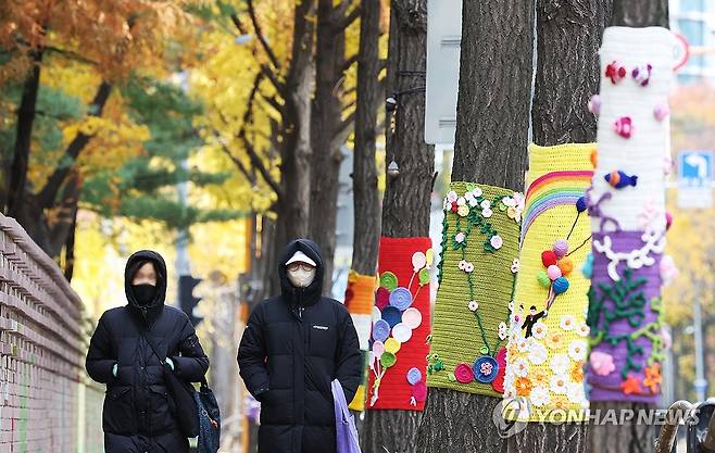 (광명=연합뉴스) 홍기원 기자 = 북쪽에서 찬 공기가 유입되며 추위가 찾아온 17일 경기도 광명시의 한 거리에서 두꺼운 옷차림의 시민들이 뜨개옷 입은 가로수길을 걷고 있다. 2025.11.17