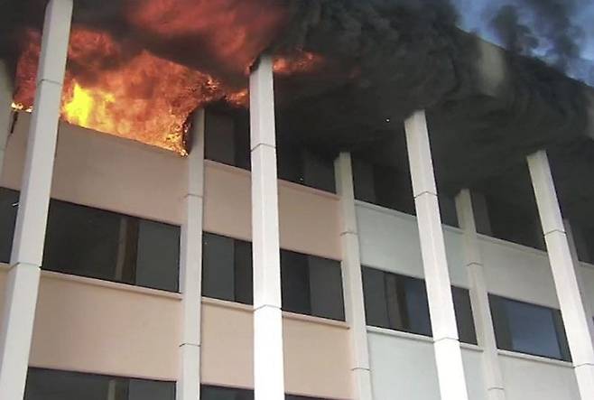 (전주=연합뉴스) 17일 오전 11시 50분께 전북 전주시 완산구 효자동 전주대학교 예술관 4층에서 불길이 치솟고 있다. 2025.11.17 [전북자치도소방본부 제공. 재판매 및 DB 금지]