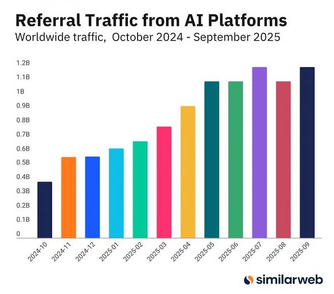 웹 분석 플랫폼 시밀러웹(Similarweb)이 공개한 데이터에 따르면, 전 세계 생성형 AI 추천 트래픽은 2025년 5월 이후 성장세가 멈췄다. 2024년 10월부터 꾸준히 증가하던 추천 트래픽은 5월을 기점으로 정체 국면에 접어들었다. 트래픽이 완전히 붕괴된 것은 아니지만, 성장이 명확히 멈춘 상태다.
