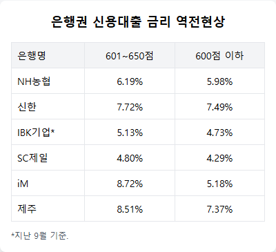 지난 9월 기준 NH농협은행은 신용점수 600점 이하 금융소비자의 가계대출 금리를 5.98%로 적용했다. 동일 기간 601~650점과 651~700점에 적용되는 금리는 6.19%, 6.11%로, 더 높은 등급보다 금리가 더 낮았다.
