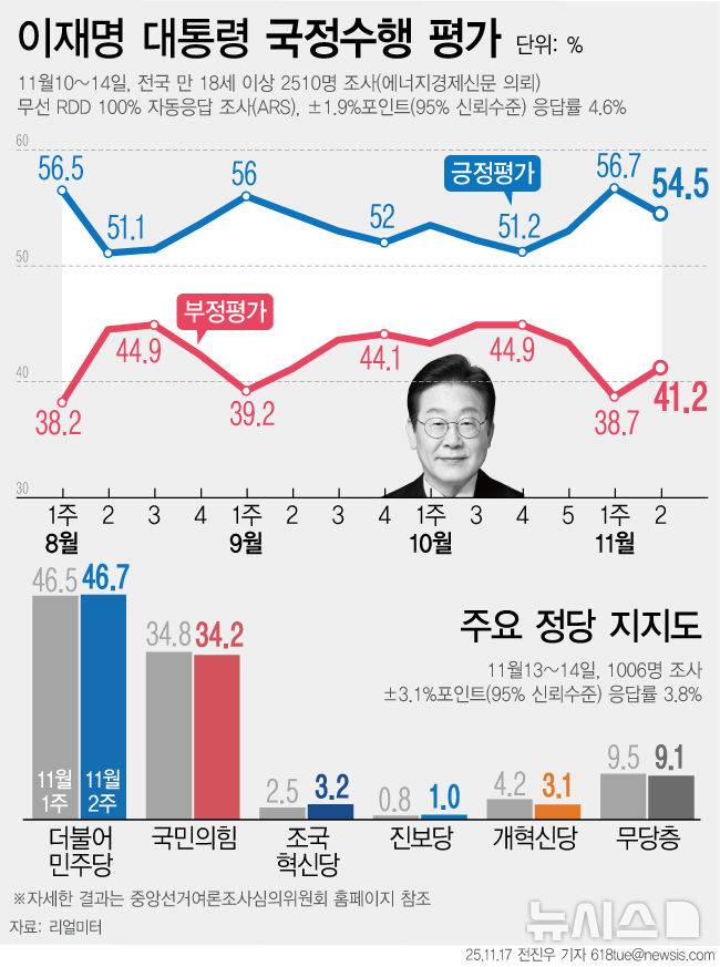 [서울=뉴시스] 여론조사회사 리얼미터가 11월 둘째 주 이재명 대통령 국정수행 평가 조사를 실시한 결과, 긍정 평가는 54.5%, 부정 평가는 41.2%로 집계됐다. 정당별로는 민주당은 46.7%, 국민의힘은 34.2%로 집계됐다. (그래픽=전진우 기자)