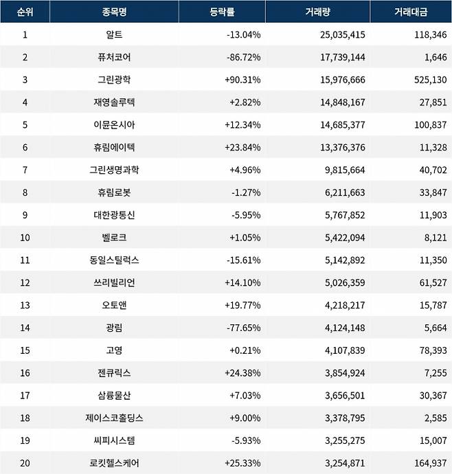 한편 거래량 상위 20위권 종목들은 동일스틸럭스(023790) ▼15.61%, 쓰리빌리언(394800) ▲14.10%, 오토앤(353590) ▲19.77%, 광림(014200) ▼77.65%, 고영(098460) ▲0.21%, 젠큐릭스(229000) ▲24.38%, 삼륭물산(014970) ▲7.03%, 제이스코홀딩스(023440) ▲9.00%, 씨피시스템(413630) ▼5.93%, 로킷헬스케어(376900) ▲25.33% 등의 성적을 기록했다.