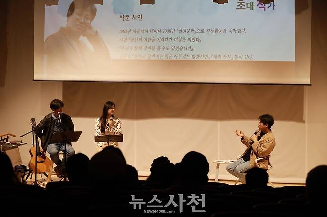 | ▲ 사천시립도서관과 문화예술창작집단 '울림'이 15일 오후 시립도서관 1층 대강당에서 '마중도 배웅도 없이'라는 주제로 박준 시인 초청 시담시담(詩談時談) 문학콘서트를 열었다. |