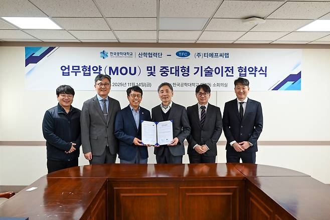 한국공학대학교(총장 황수성)가 반도체 장비 전문기업 ㈜티에프씨랩(대표 최성순)과 손잡고 기술사업화와 인재양성의 새로운 산학협력 모델을 제시했다. 양 기관은 11월 14일(금) 교내 행정동 소회의실에서 업무협약 및 기술이전 협약식을 체결하고, 산업계 수요 기반의 공동연구와 대학 보유 기술의 이전, 그리고 반도체 전문인력 양성을 함께 추진하기로 했다.