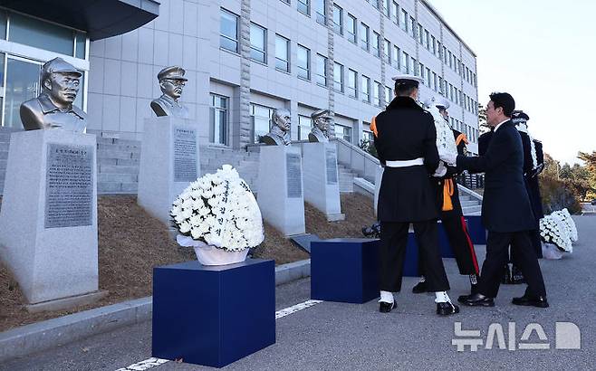 [서울=뉴시스] 청사사진기자단 = 김민석 국무총리가 17일 서울 노원구 육군사관학교에서 열린 제86회 순국선열의 날 기념식에 앞서 홍범도 장군을 비롯한 독립전쟁 영웅 흉상에 헌화하고 있다. 2025.11.17. photo@newsis.com