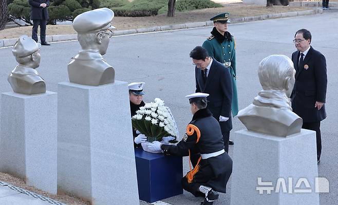 [서울=뉴시스] 청사사진기자단 = 김민석 국무총리가 17일 서울 노원구 육군사관학교에서 열린 제86회 순국선열의 날 기념식에 앞서 홍범도 장군을 비롯한 독립전쟁 영웅 흉상에 헌화 후 묵념하고 있다. 2025.11.17. photo@newsis.com