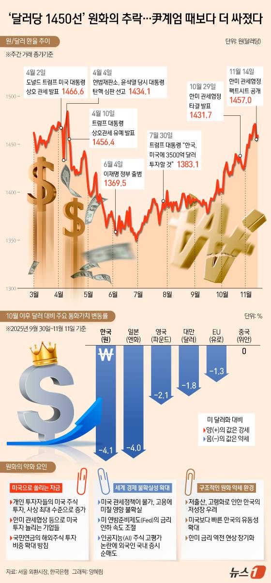 [오늘의 그래픽] '달러당 1450선' 원화의 추락…尹계엄 때보다 더 싸졌다