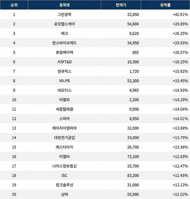 6위 서부T&D(006730)는 종가 10,300원으로 18.25% 상승 마감했다. 7위 젠큐릭스(229000)는 종가 1,720원으로 15.82% 상승 마감했다. 8위 비나텍(126340)은 종가 52,300원으로 15.45% 상승 마감했다. 9위 네오티스(085910)는 종가 4,965원으로 14.93% 상승 마감했다. 10위 이엘피(063760)는 종가 2,200원으로 14.29% 상승 마감했다.