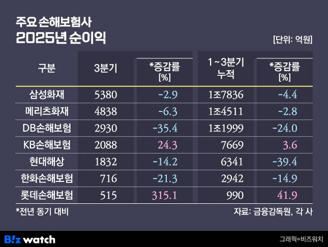 17일 보험업계에 따르면 3분기 7개 손보사(삼성화재·메리츠화재·DB손해보험·KB손해보험·현대해상·한화손해보험·롯데손해보험)의 순이익은 1조8299억원으로 전년 동기(1조9879억원) 대비 7.9% 감소했다.