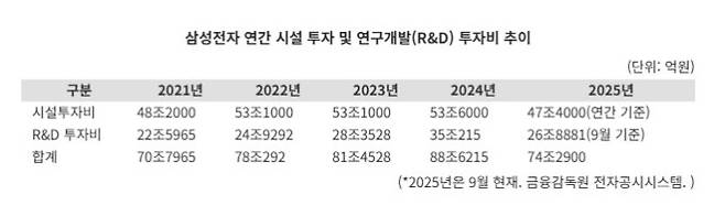 17일 업계에 따르면, 삼성전자의 연간 시설투자 및 연구개발(R&D) 비용은 지난 2021년 70조7965억원에서 △2022년 78조292억원 △2023년 81조4528억원 △2024년 88조6215억원으로 매년 꾸준히 증가했다. 이 기간 동안 총투자액은 25.2%(17조8250억원) 늘었고 연평균 증가율도 7.8%에 달했다. 올해 역시 3·4분기까지 누적 투자액이 약 75조원에 이른 가운데 하반기까지 대규모 투자가 이어질 경우 연간 80조원 돌파는 무난할 전망이다. 삼성전자가 미래 경쟁력 확보를 위해 연간 최소 80조 내외 투자를 고수해왔다는 해석이 나온다.