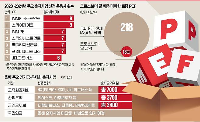17일 투자은행(IB)업계에 따르면 2020년부터 지난해까지 최근 5년간 국민연금과 한국교직원공제회 등 주요 연기금·공제회가 진행한 출자 사업(총 출자 규모 3000억원 이상)에서 스카이레이크는 아홉 차례 선택을 받았다. IMM PE와 스틱인베스트먼트, 프리미어파트너스는 각각 일곱 차례, JKL파트너스는 여섯 차례 선정됐다. 이들 PEF가 선정된 횟수가 전체에서 차지하는 비중은 33%에 달하는 것으로 나타났다.