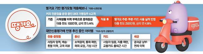 # 커피 전문점을 창업한 20대 A씨는 최근 사업을 확대하는 과정에서 자영업자 신용대출 문을 두드렸다. 현 금융권의 한도는 고작 1000만원에 이자도 연 5.44%로 높았다. 반면 신한은행의 배달앱 '땡겨요' 팀은 A씨가 운영하는 커피 전문점의 배달 주문 실적이 우수하고 쿠폰 사용률도 높은 점 등을 반영했다. 이에 대출 한도가 2500만원까지 늘어나고 금리도 연 4.98%로 기존 대비 0.46%포인트 낮아졌다.