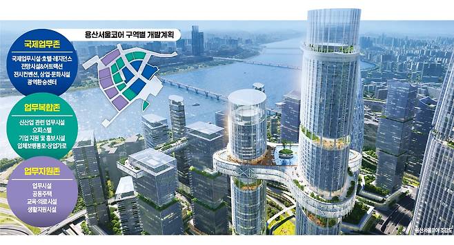 단군 이래 최대 개발사업(사업비 50조원)이라고 불리는 서울 ‘용산서울코어’(용산국제업무지구) 프로젝트가 본격 추진된다. 최고 100층 높이의 랜드마크 빌딩을 비롯해 프라임 오피스(연면적 10만㎡ 이상 규모)와 호텔, 마이스(MICE), 상업, 주거시설이 한데 어우러진 글로벌 초고층 복합지구로 조성된다. 도심항공교통(UAM)이 뜨고, 자율주행 순환버스가 다니는 미래도시 면모도 갖춘다. 국가 경쟁력을 한 단계 끌어올리는 마중물 역할을 할 것이란 기대가 나온다.