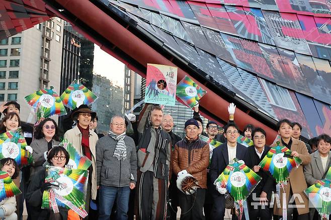 [서울=뉴시스] 김명원 기자 = 제5회 서울도시건축비엔날레 총감독을 맡은 세계적인 디자이너 토마스 헤더윅(Thomas Heatherwick))과 세계적인 연날리기 명장 리기태(한국연협회·리기태연보존회 회장))이 17일 서울 종로구 열린송현 녹지광장에서 열린 폐막식에서 참석자들과 방패연 및 기념녕을 들어보이며 기념촬영을 하고 있다. 2025.11.17. kmx1105@newsis.com