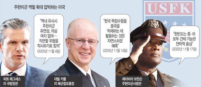 미국의 동맹 현대화 요구는 정책 제시를 넘어 작전 구상까지 확대되고 있다. 피트 헤그세스 미 국방장관은 지난 4일 제57차 한·미안보협의회(SCM)를 마친 뒤 “주한미군이 역내 유사시 유연성을 갖는 것에 의심의 여지가 없다”고 말했다. 대릴 커들 미 해군참모총장은 14일 “한국이 핵잠수함을 중국 억제에 활용하는 건 자연스러운 예측”이라고 언급했다. 같은 날 발표된 SCM 공동성명에선 매년 포함되던 주한미군의 ‘현 수준 유지’ 문구가 빠졌다. 군 안팎에선 미국이 한반도 방어 전력인 육군 위주 배치에서 벗어나 해·공군을 포함한 다층적 전력 구성을 염두에 둔 신호라는 해석이 나왔다.