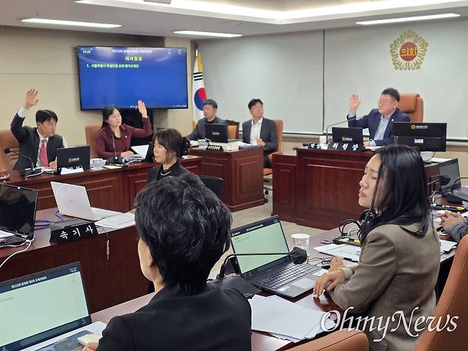 | ▲ 17일 오후 7시 20분, 서울시의회 교육위는 주민조례발안에 관한 법률에 따라 발의된 서울시 학생인권조례 폐지 조례안을 찬성 7명, 반대 4명으로 통과시켰다. 사진은 찬성표를 던지는 국민의힘 소속 서울시의원들. |