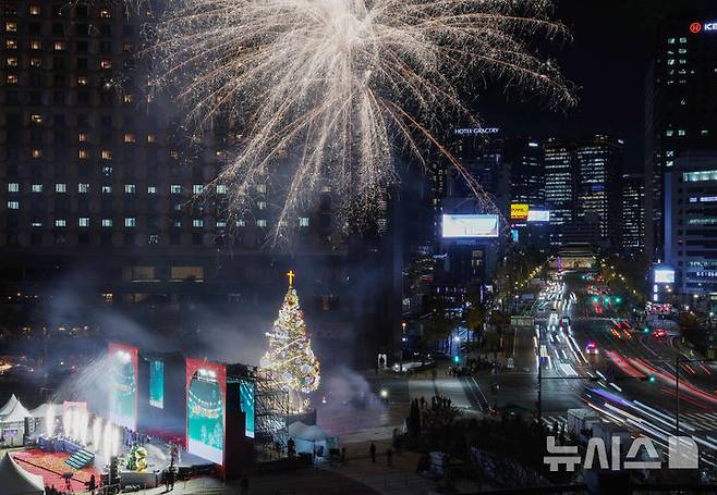 [서울=뉴시스] 김진아 기자 = 17일 서울 중구 서울광장에서 열린 성탄트리 점등식에서 트리에 불이 켜지고 있다. 2025.11.17. bluesoda@newsis.com