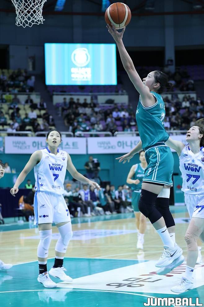 놀라운 한 판이었다. 지난 시즌 최하위의 모습은 온데 간데 없는 경기력이었다. 하나은행은 2쿼터를 기점으로 좋은 공수 밸런스를 토대로 리드를 이어나갔다. 이이지마 사키(11점 6리바운드)가 중심을 잡았고, 영건들(박소희, 고서연, 정현)은 번갈아가며 3점슛을 터트렸다. 3쿼터까지 김단비를 7점으로 묶기까지 했다. 리바운드 싸움(49-32)도 압도했다.