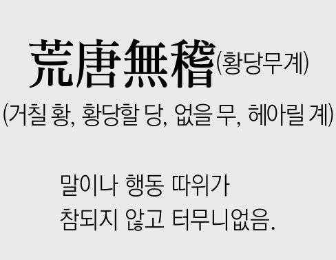● 유래: 장자(莊子) 천하편(天下篇)에서 유래한 '황당(荒唐)'과 서경(書經) 대우모(大禹謨)에서 유래한 '무계(無稽)'가 합쳐져 만들어진 성어입니다.