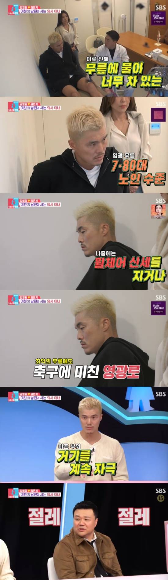 김영광은 "양쪽 무릎에 십자인대가 없다. 연골끼리 부딪혀서 계속 물이 찼다"고 했다. 김영광은 십자인대 파열로 2번이나 수술을 했고, 퇴행성 관절염 진단까지 받은 상황이었다.